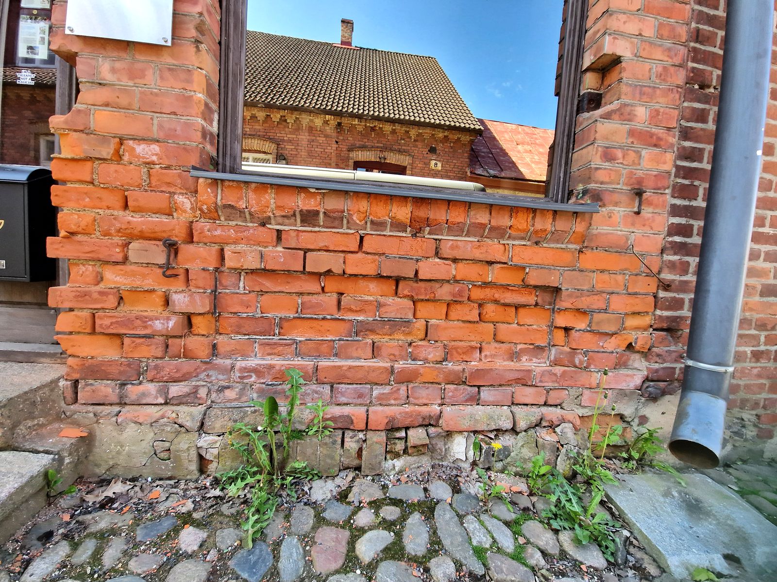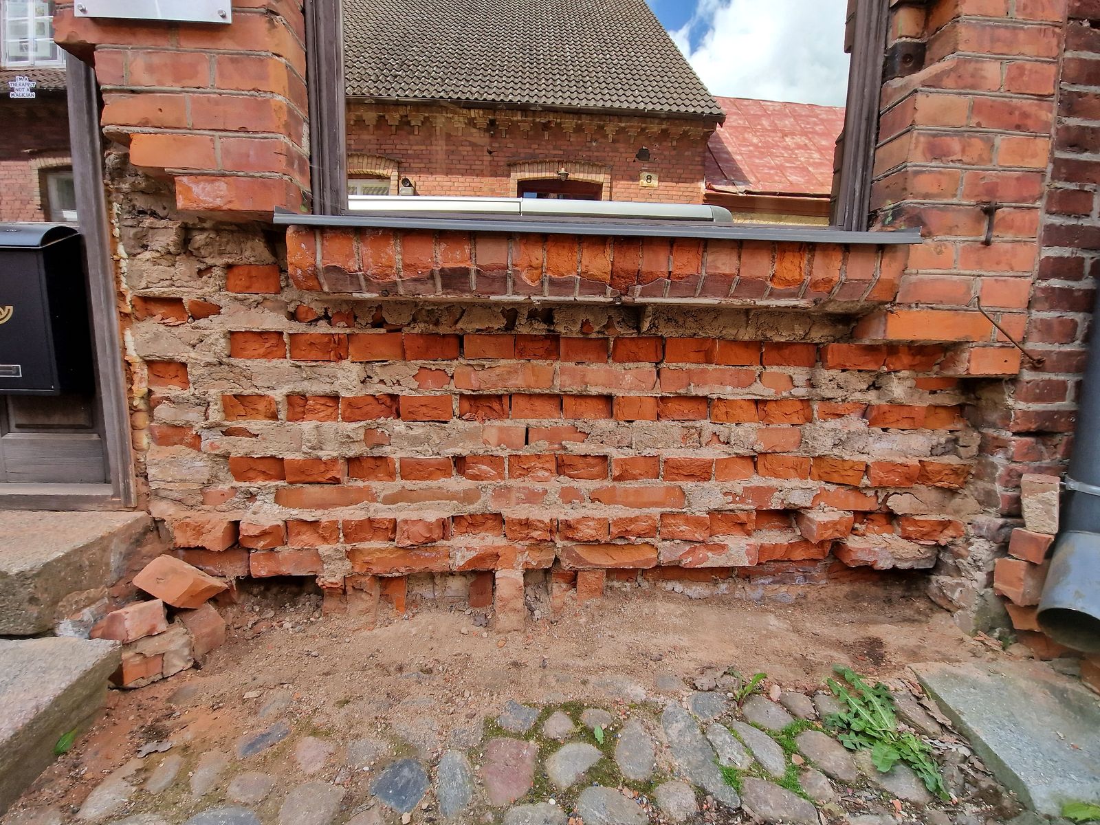 2025a Mail lõpus pigistasin teiste tööde vahelisse nädalavahetusse ühe pisema töö. Lihtsalt sellepärast, et see oli oma kodukandis. Tegemist oli tellistest laotud fassaadi jupiga, mille alumine osa oli ajale ja ilmastiku tingimustele järele andnud. Pole ka väga imestada, see maja on seal püsinud juba üle saja aasta.